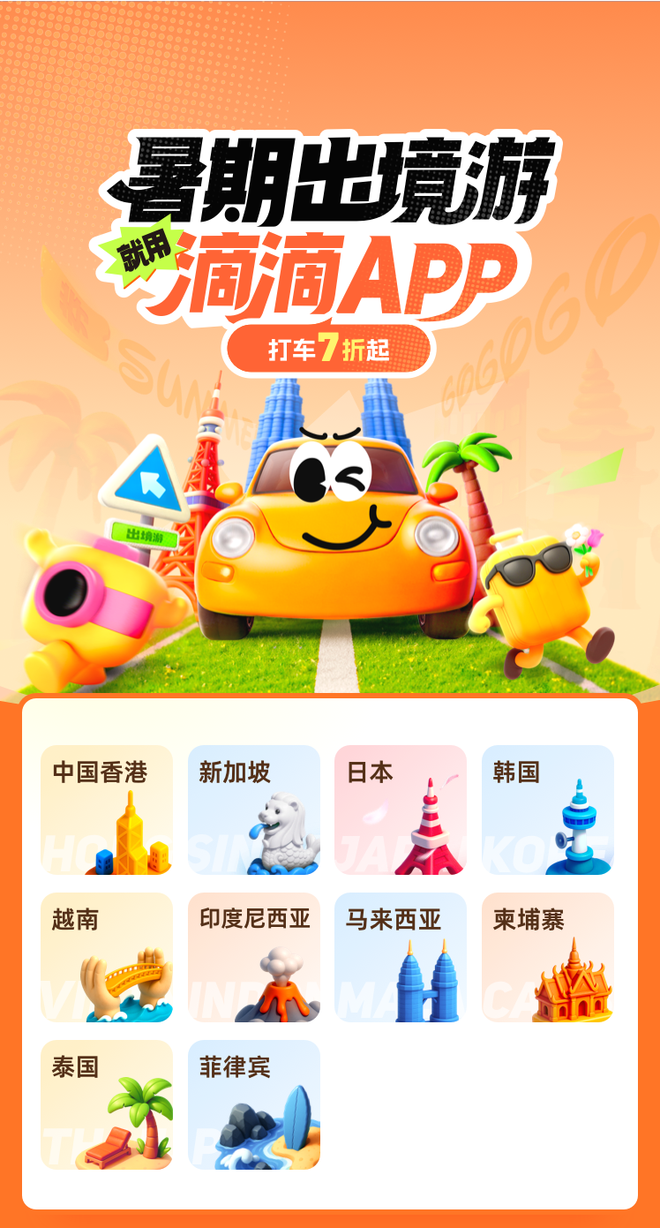 随着暑期旅游旺季开启,探亲访友、家庭结伴出游需求持续走高,跨境游市场呈现爆发式增长。为让国人跨境出游享受更方便、更优惠的打车服务,滴滴推出暑期打车7折起活动,覆盖中国香港地区和韩国、新加坡、马来西亚等9个国家。