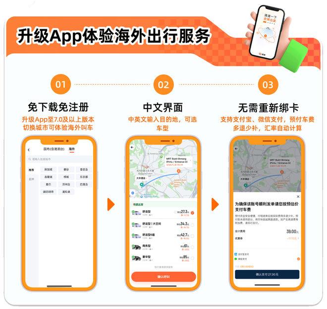 自滴滴海外出行上线以来,已持续在春节、五一、端午等多个假期为用户跨境出游提供便捷、实惠的出行服务。在使用上也非常便捷,用户无需额外下载或注册其它打车软件,将滴滴App升级至最新版,点击左上角切换城市,选择海外城市;或在海外出行开通服务城市自动定位,即可体验丝滑的打车服务。海外出行还支持用中英文输入起、终点;支持使用支付宝、微信预付车费,汇率自动计算;用户可在App内用中文和司机即时沟通,支持中文客服,让用户不再为语言障碍感到发愁。
