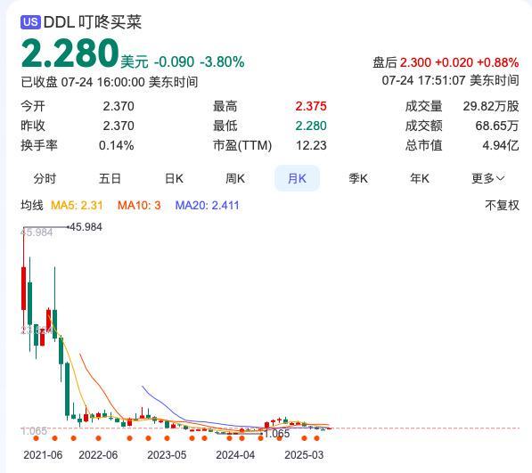 截至目前,叮咚买菜股价为2.28美元/股,市值4.94亿美元,较2021年最高点45.984美元/股已下滑近95%。