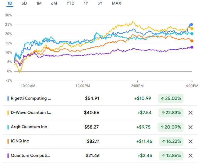 声明发布后,作为27个细分投资领域之一的量子计算板块股价集体飙升。据市场数据显示,Rigetti股价周一收盘大涨25%,D-Wave上涨23%,Arqit上涨20%,IONQ攀升16%,Quantum Computing也上涨了12%。