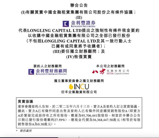 6月24日晚,香港上市公司中国金融租赁集团有限公司发布公告,原股东林树松及首都创投已向独立第三方Longling Capital(要约人)转让合计1.21亿股股份,占公司总股本约34.96%,总代价为4608万港元。