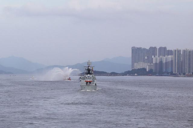 7月3日,中国海军山东舰航母编队抵达香港。这是特区政府消防船为舰艇编队举行水门礼。新华社发(贾晓鹏 摄)