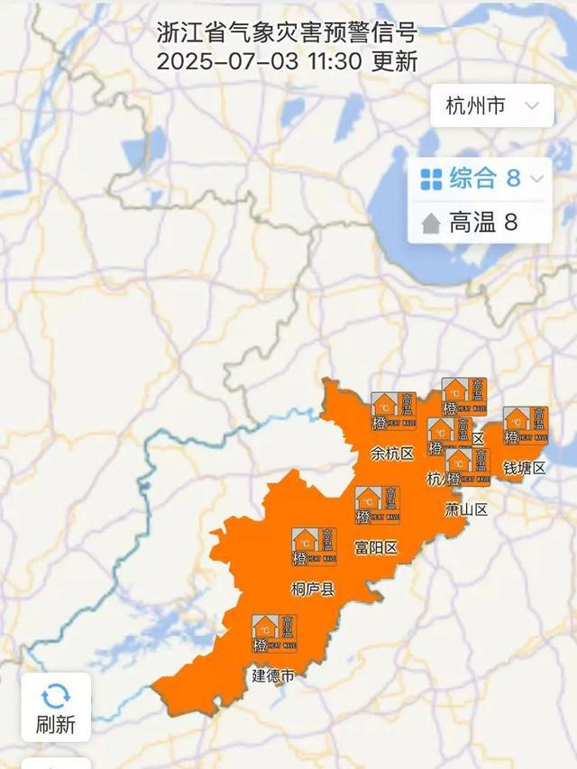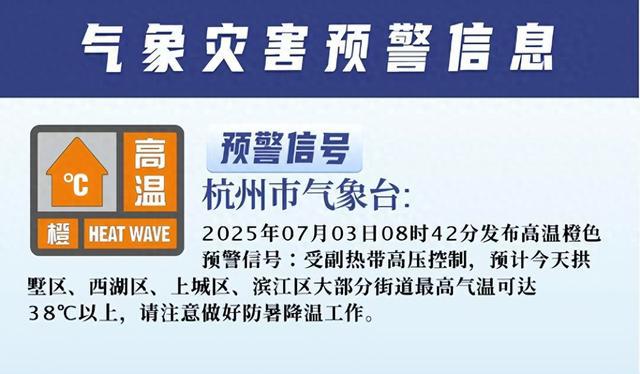 据杭州发布,今天8时42分,杭州连续第3天发布高温橙色预警!本轮高温将在7月6日前后迎来峰值,再次提醒市民:每天10点到16点减少出门!