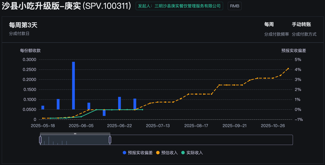 信风查询一家沙县小吃SPV发现,信披内容已涵盖每份额首款、预报实收偏差、预估收入、实际收入、回购触发条件等诸多关键信息。