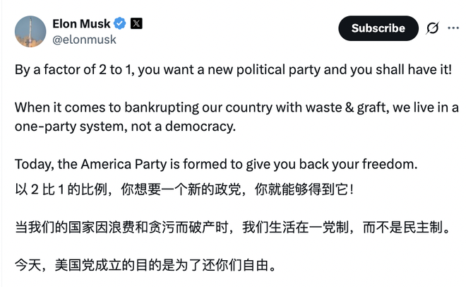 马斯克正式宣布成立“美国党”,瞄准2026中期选举关键席位。