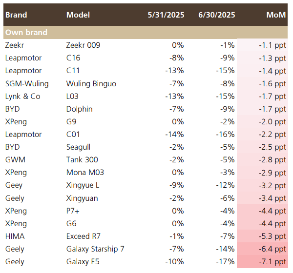 报告指出,在竞争加剧的背景下,6月各品牌零售折扣普遍扩大。吉利、小鹏和零跑的降价幅度都超过了行业龙头比亚迪。