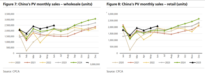 据中国乘用车协会数据显示,6月批发销量升至250万辆,同比增长15%,环比增长8%。零售交付强劲,达到210万辆,同比增长18%,环比增长8%。