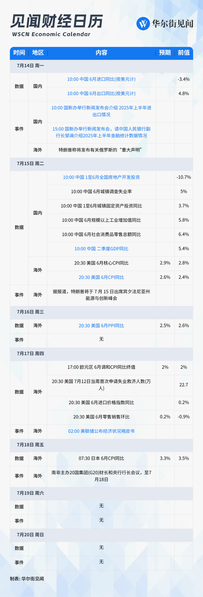 7月14日-7月20日当周重磅财经事件一览,以下均为北京时间: