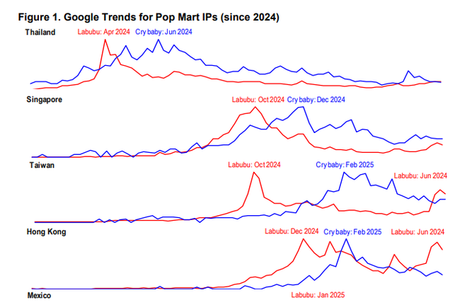 例如,Crybaby(公司2024年第四大IP)的谷歌搜索指数在Labubu搜索峰值后的一到两个季度内出现激增。此外,在Labubu 3.0推动下,香港和台湾地区在2025年6月经历了对Labubu的第二波搜索兴趣高潮,进一步验证了公司IP运营的可持续性。